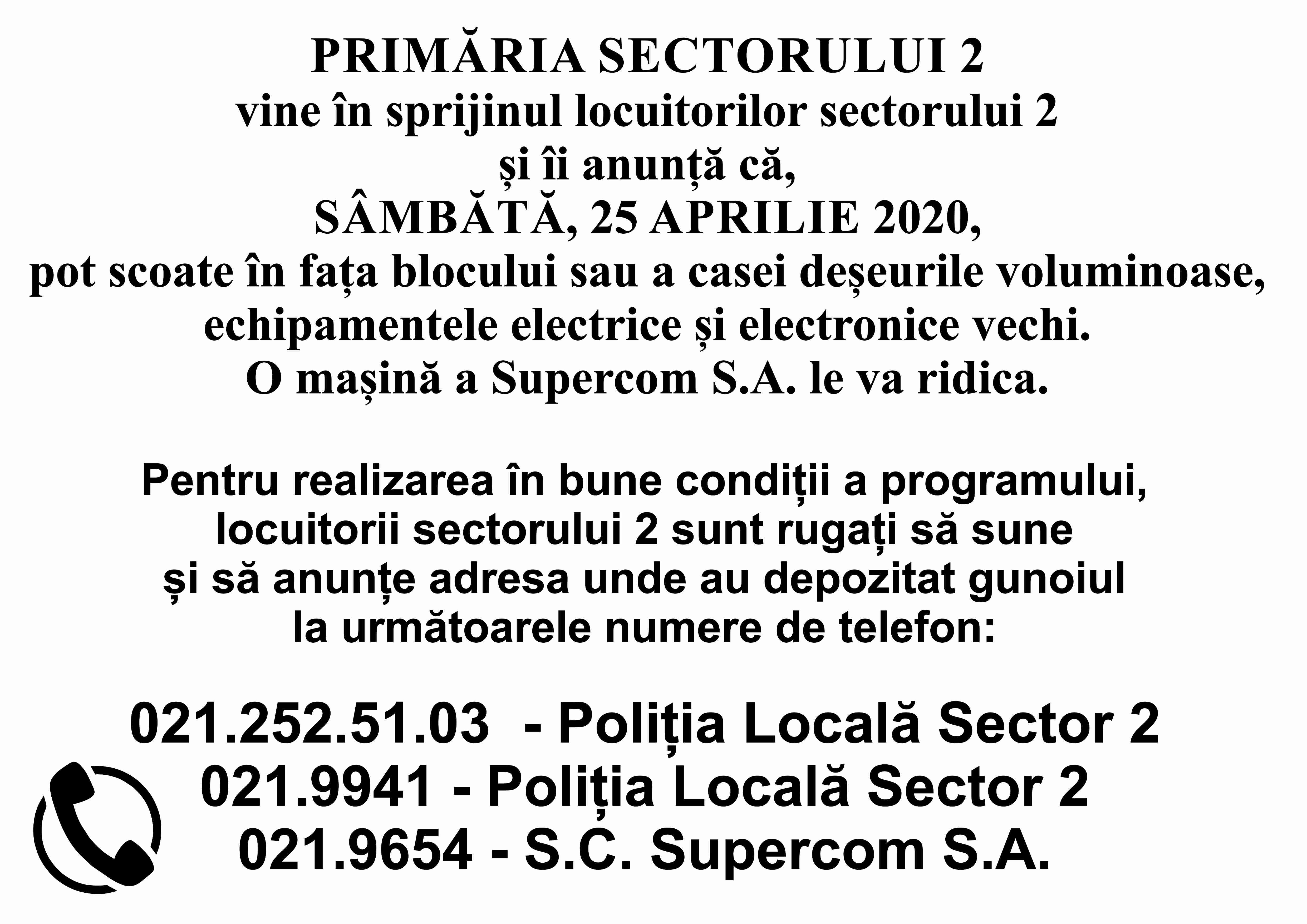 Locuitorilor sectorului 2 care doresc să scape gratuit de deșeurile voluminoase (mai puțin cele provenite din construcții, care se ridică contracost) și de DEE-uri sunt invitați să le depună în fața locuințelor de domiciliu sâmbătă, 25 aprilie 2020.