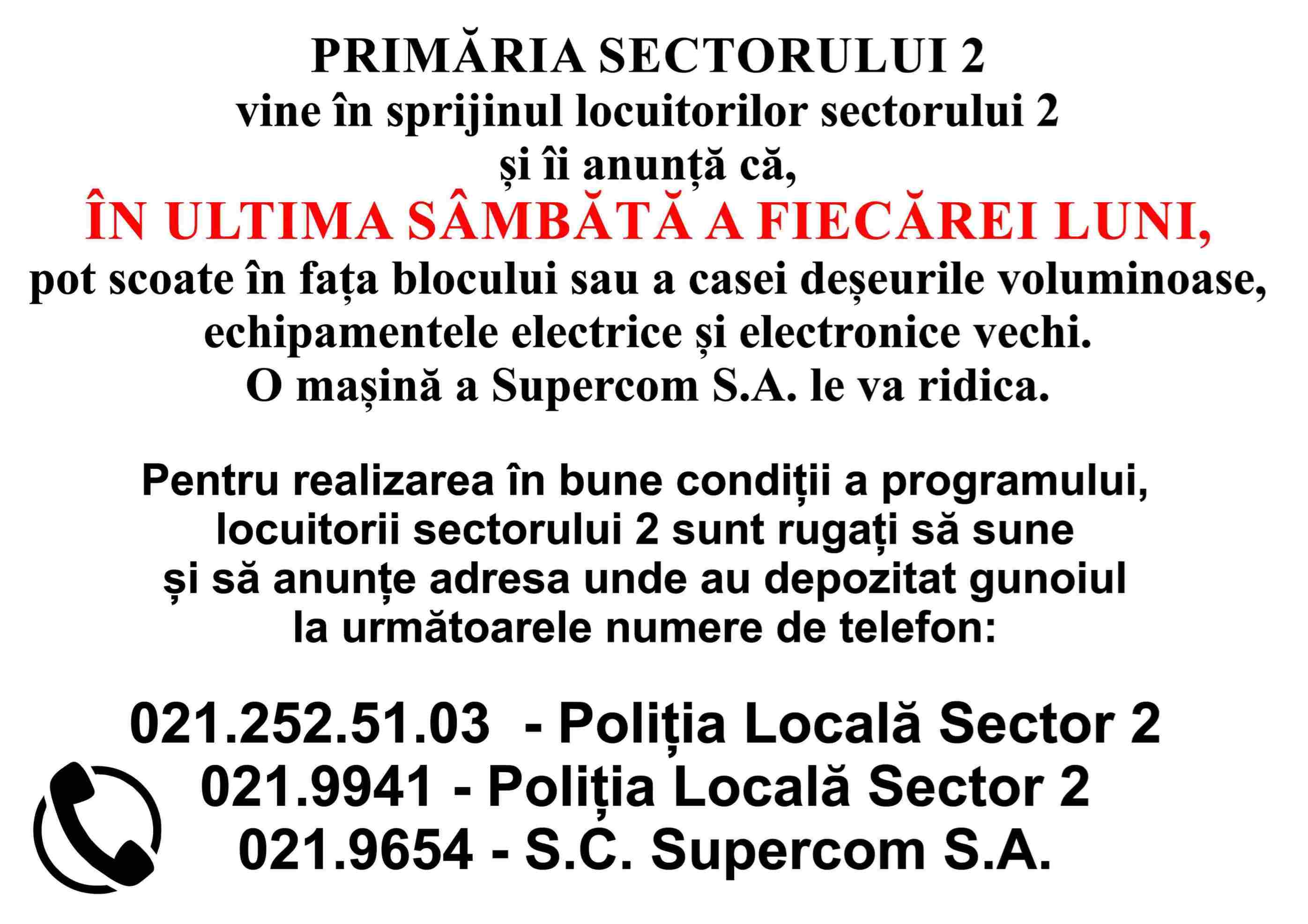 Pentru desfășurarea în bune condiții a programului, locuitorii sectorului 2 sunt rugați să sune și să anunțe adresa unde au depozitat gunoaiele la următoarele numere de telefon: