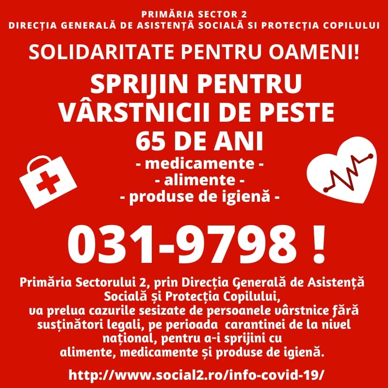 Persoanele fără susținători legali cu vârstă peste 65 de ani din sectorul 2 au la dispoziție o nouă linie telefonică specială cu numărul 031 – 9798, pe care o pot apela de luni până vineri, în intervalul orar 08.00- 20.00.